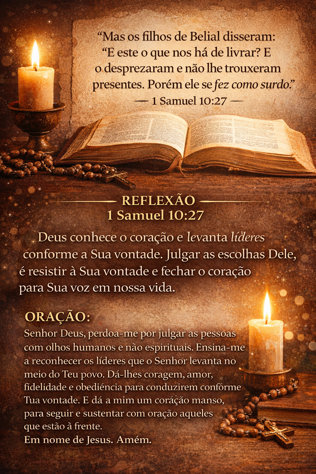 Senhor Deus, perdoa-me por julgar as pessoas com olhos humanos e não espirituais. Ensina-me a reconhecer os líderes que o Senhor levanta no meio do teu povo. Dá-lhes coragem, amor, fidelidade e obediência para conduzirem conforme tua vontade. E dá a mim um coração manso, para seguir e sustentar com oração aqueles que estão à frente. Em nome de Jesus. Amém.